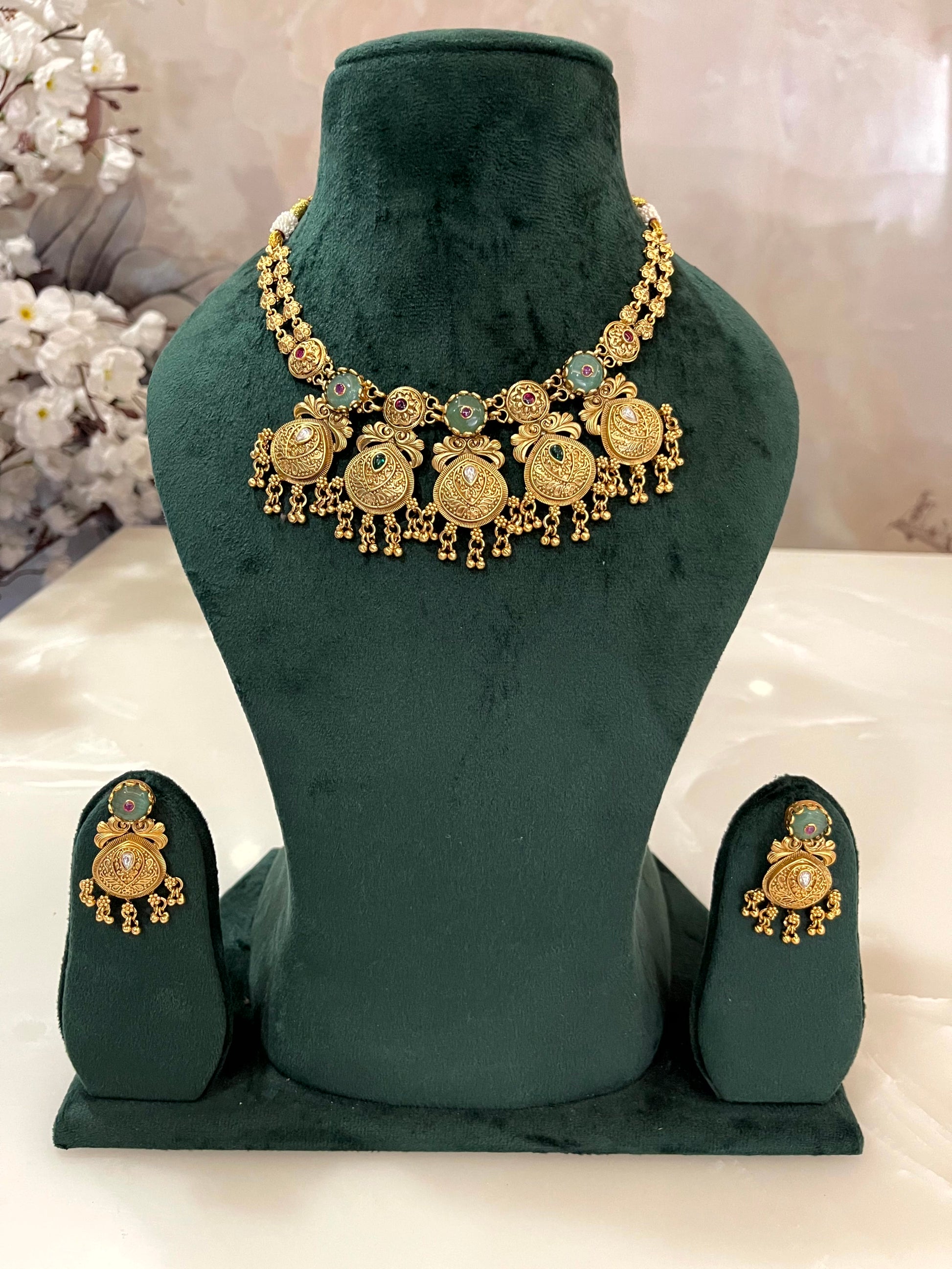 Soft green enamel highlights, ruby-red stone accents, and delicate gold bead danglers add depth and movement to the design. The matching earrings mirror the coin motif perfectly, creating a harmonious and graceful set ideal for weddings, festive occasions, and traditional ceremonies.