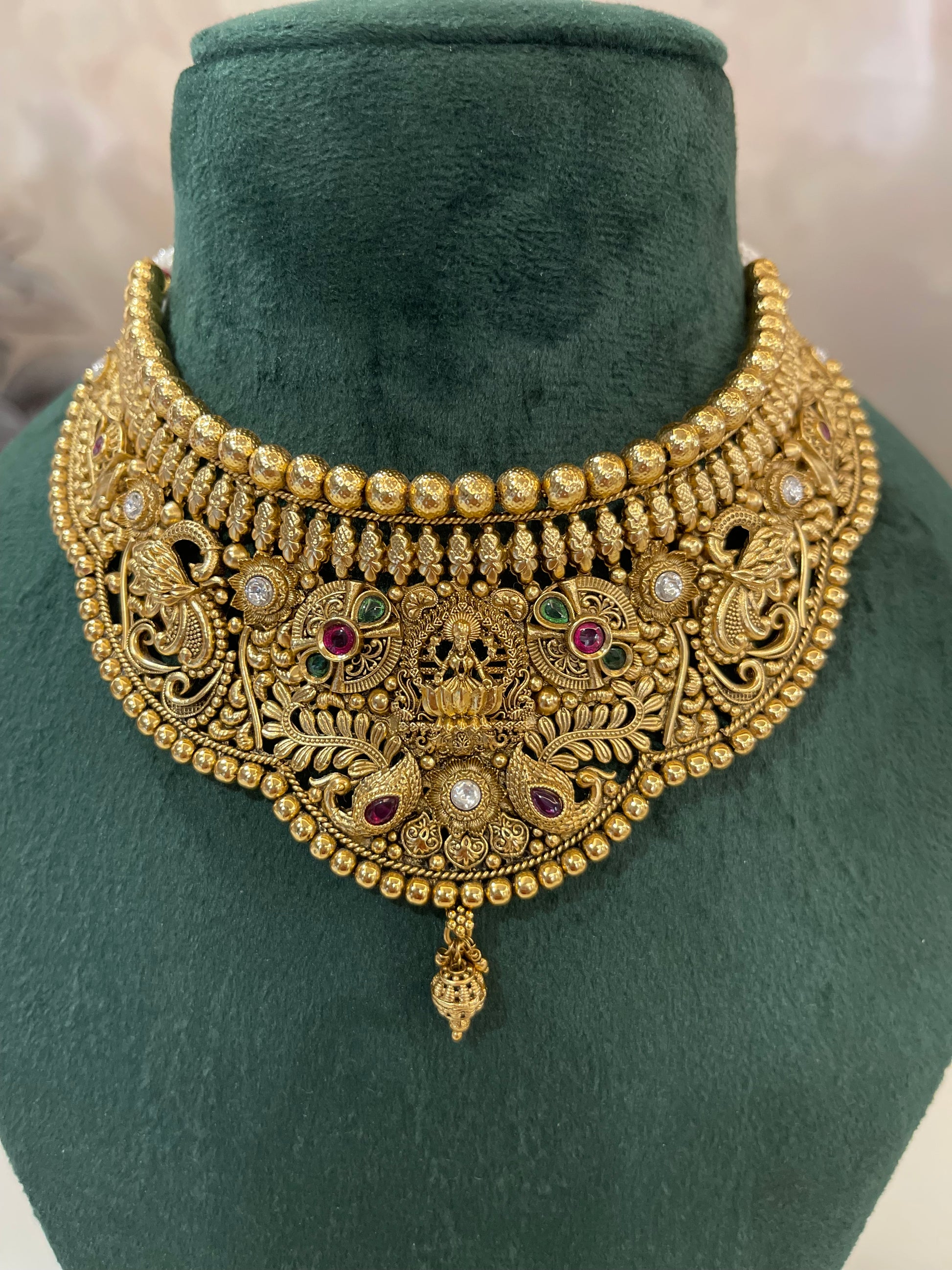 Padmavat Choker Necklace Gold plated with coloured stones with intricate craftsmanship. The rich detailing and extravagant design draw inspiration from traditional jewellery with modern karigari. Perfect for Grand occasions this regal piece exudes timeless elegance. Statement Jewellery.