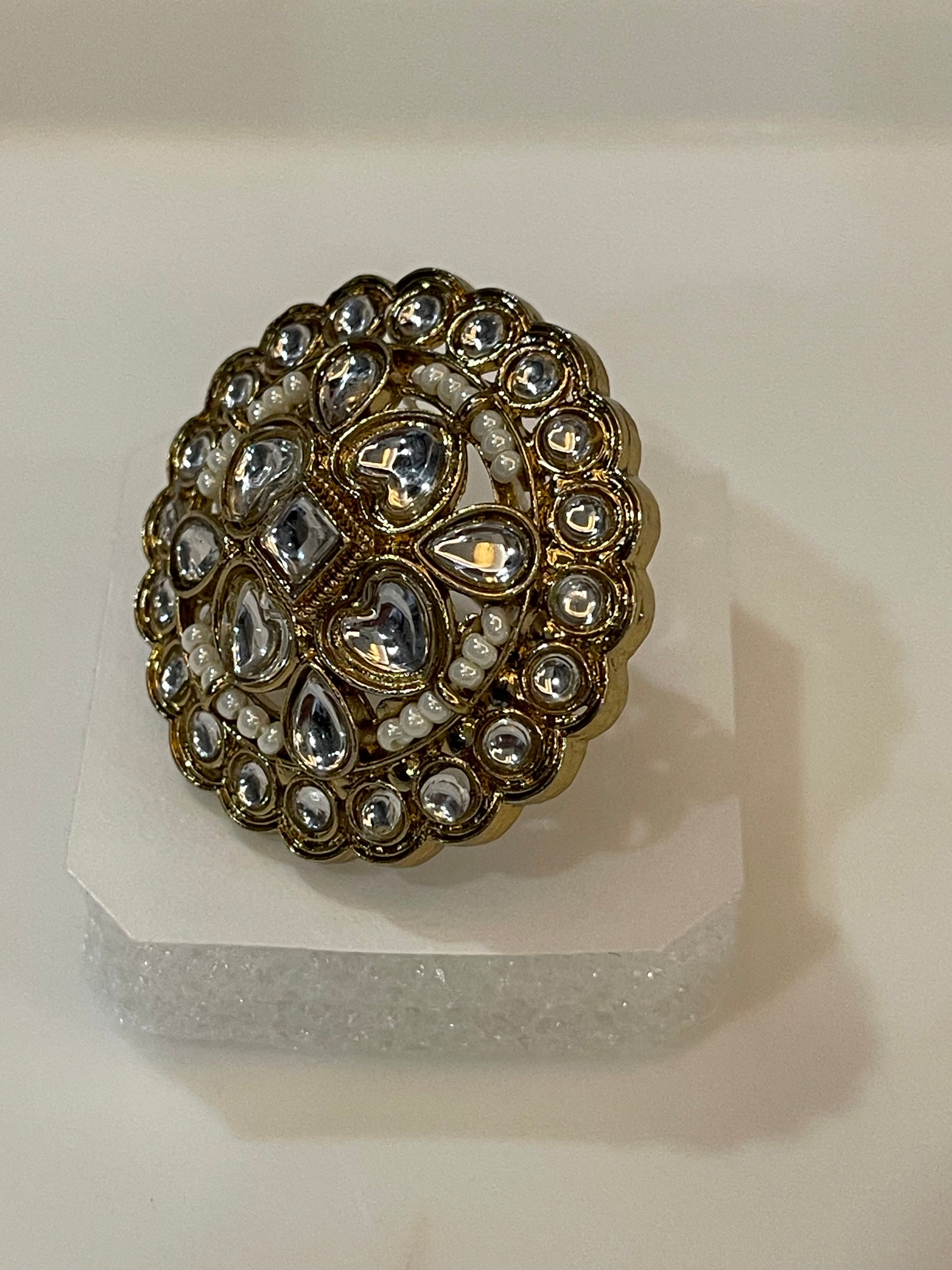 Elegant Kundan ring features intricate craftsmanship with golden plating and clear gemstones. With an adjustable size, this ring is perfect for any occasion, whether it's wedding, festival, or everyday wear.