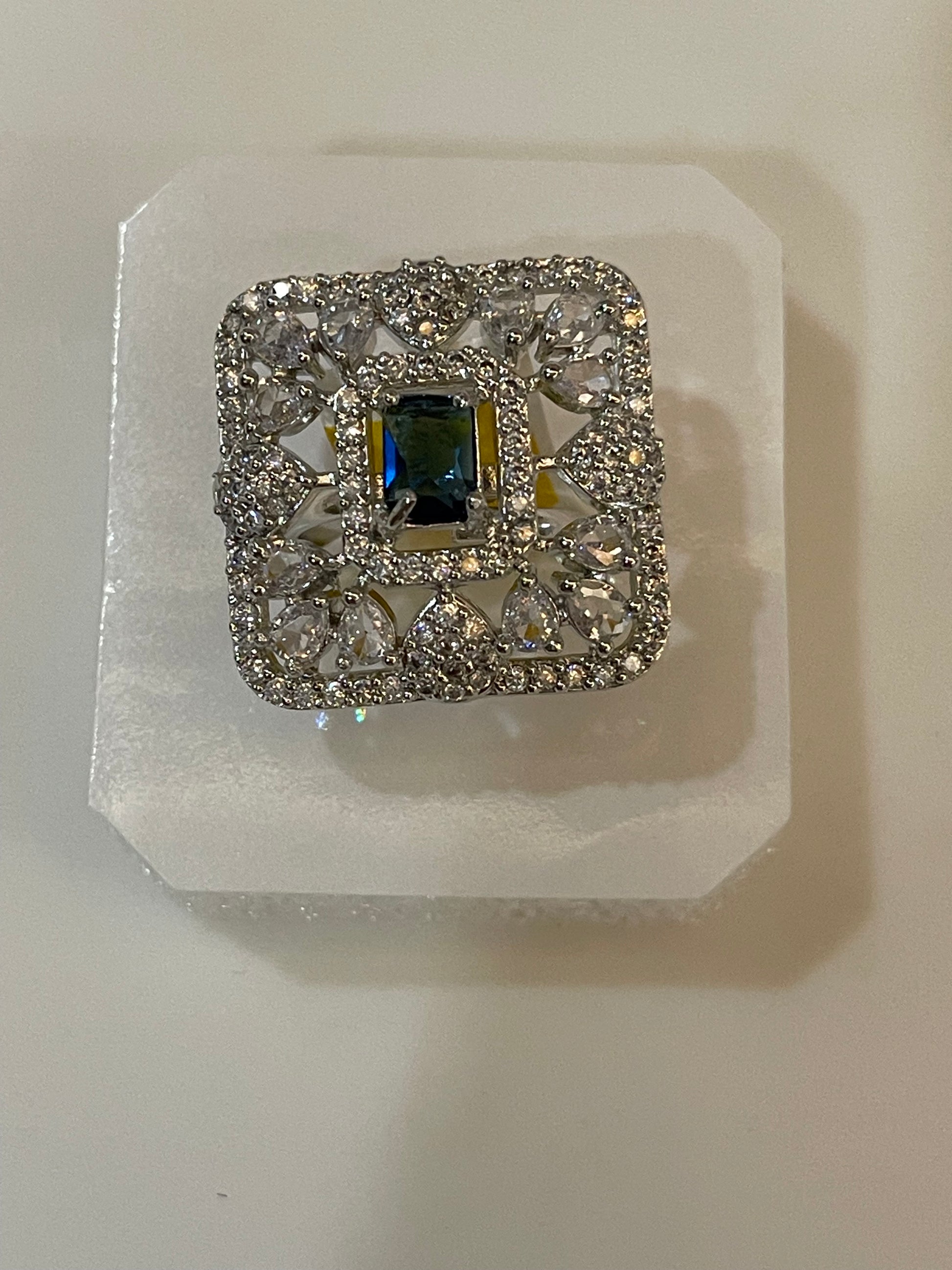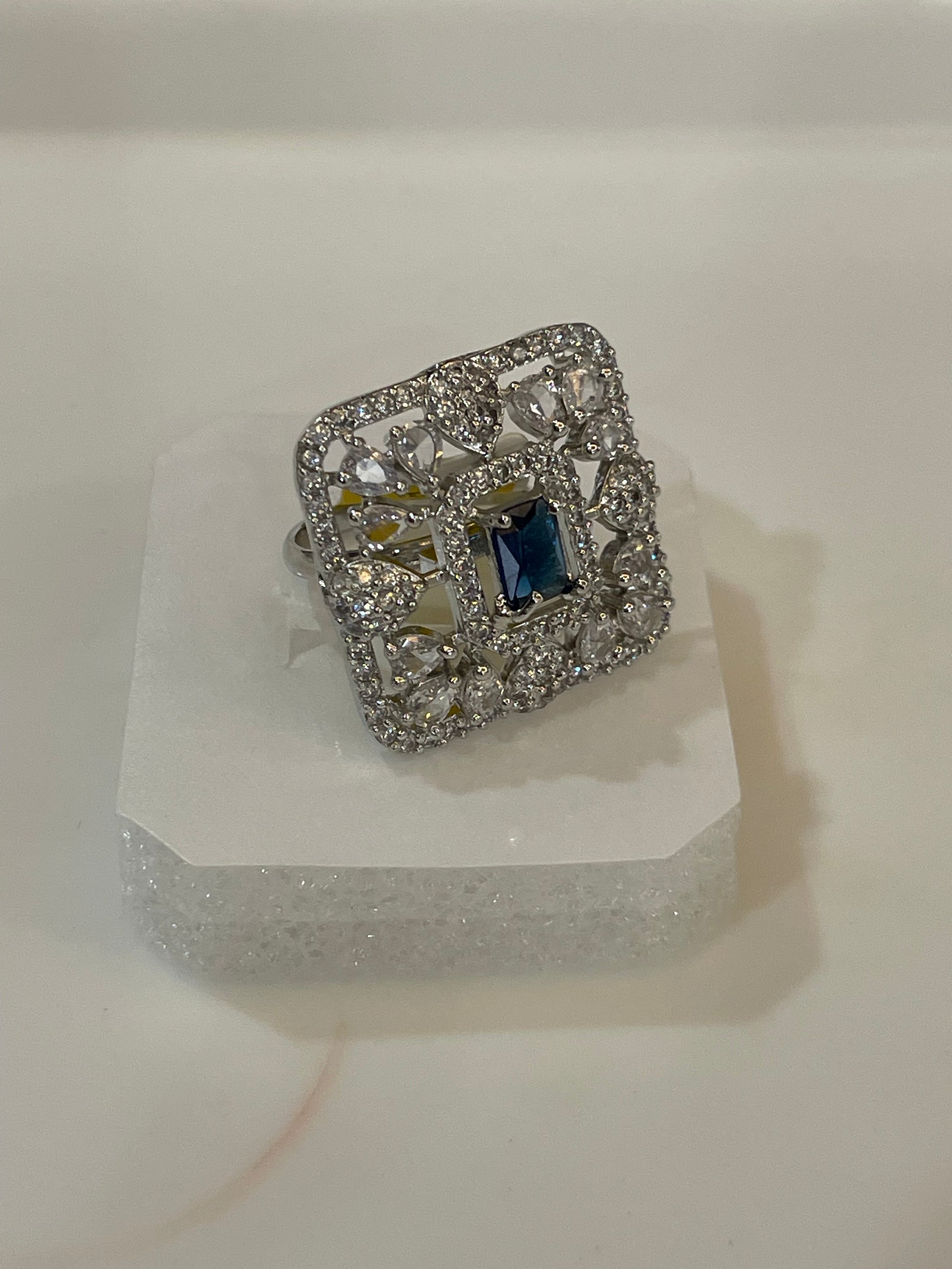 The Noor-e-Nafis Sapphire Square Ring features a deep blue emerald-cut center stone framed by a delicate pave border, set in a bold square silhouette. An intricate openwork halo of sparkling white stones creates a lace-like effect, giving the ring a luxurious, high-jewellery feel perfect for weddings, receptions, and evening events. The striking geometric shape and cool silver finish make it a standout cocktail piece that instantly elevates both Indian and Western outfits.
