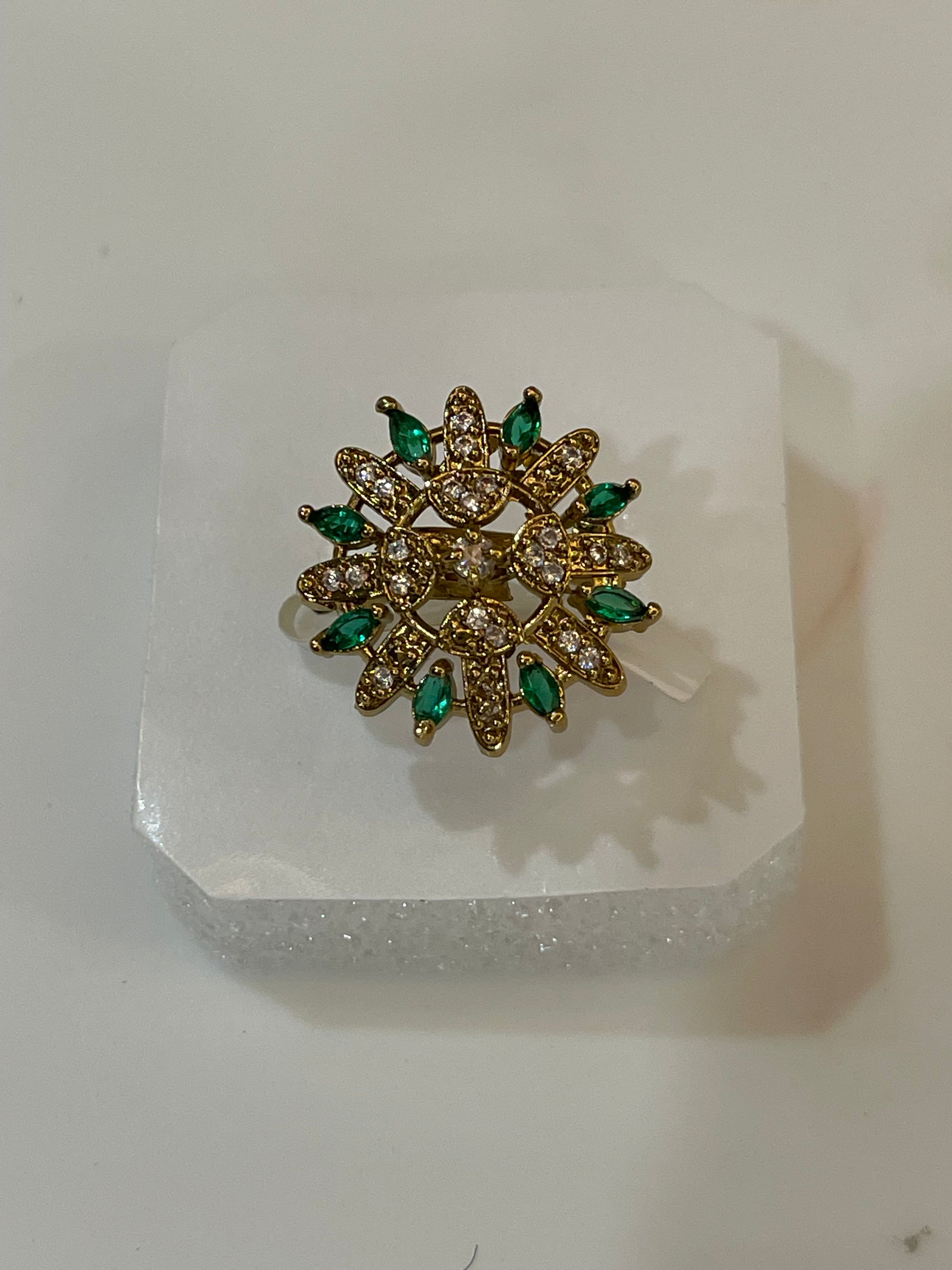 The Jade Phoolarvi Statement Ring features a full floral motif, with two layers of petal-like shapes encrusted in clear stones and tipped with rich marquise accents in Green or Red color. The warm gold base and sparkling pave detailing create a sunburst effect, making it perfect for mehendi, sangeet, and festive celebrations. Its bold round silhouette beautifully covers the finger while the green/red highlights add a pop of colour that pairs effortlessly with both traditional and Indo-western outfits.