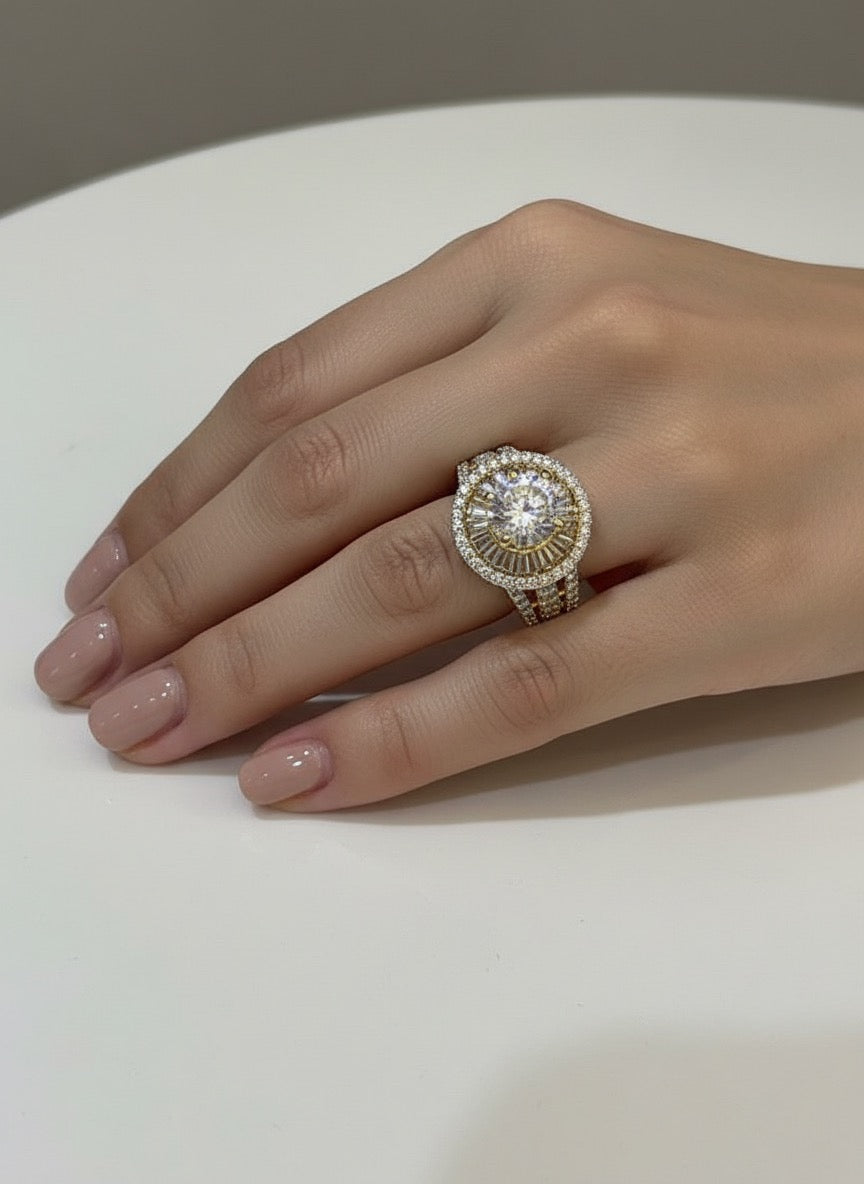 The Aurora Sunburst Halo Ring showcases a rich yellow-gold band with split shoulders, completely studded with tiny, shimmering crystals for maximum sparkle. At the center sits a brilliant round stone, framed by a sunburst of baguette-cut crystals and an outer halo of pave accents, creating a radiant, glowing effect. The bold yet elegant design makes it perfect as a statement piece for weddings, parties or festive occasions.