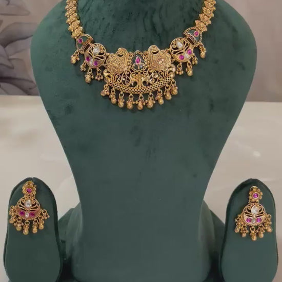 The matching earrings perfectly complement the necklace, designed with the same motif and five elegant dangling drops, creating a harmonious and authentic temple look. Ideal for weddings, festive occasions, classical dance performances, and traditional celebrations, this necklace set adds timeless elegance to ethnic attire.