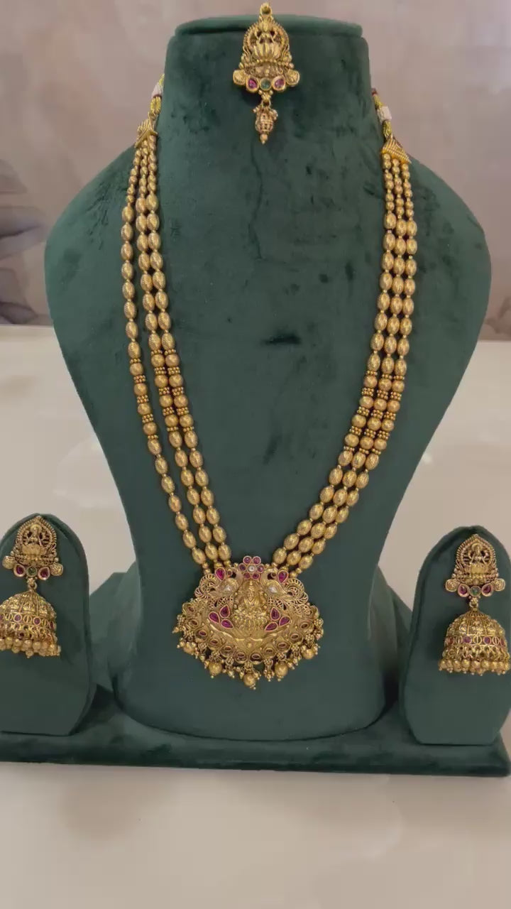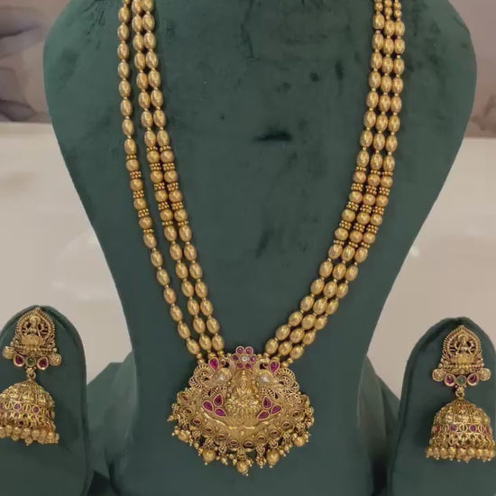 Presenting the Shri Lakshmi Rajwadi Long Haar Necklace Set, a classic South Indian–inspired imitation jewellery set designed for grand traditional occasions. This elegant long necklace features three continuous antique gold bead chains, all seamlessly attached to a richly carved central Lakshmi pendant—without any chain joints, preserving an authentic heirloom look.