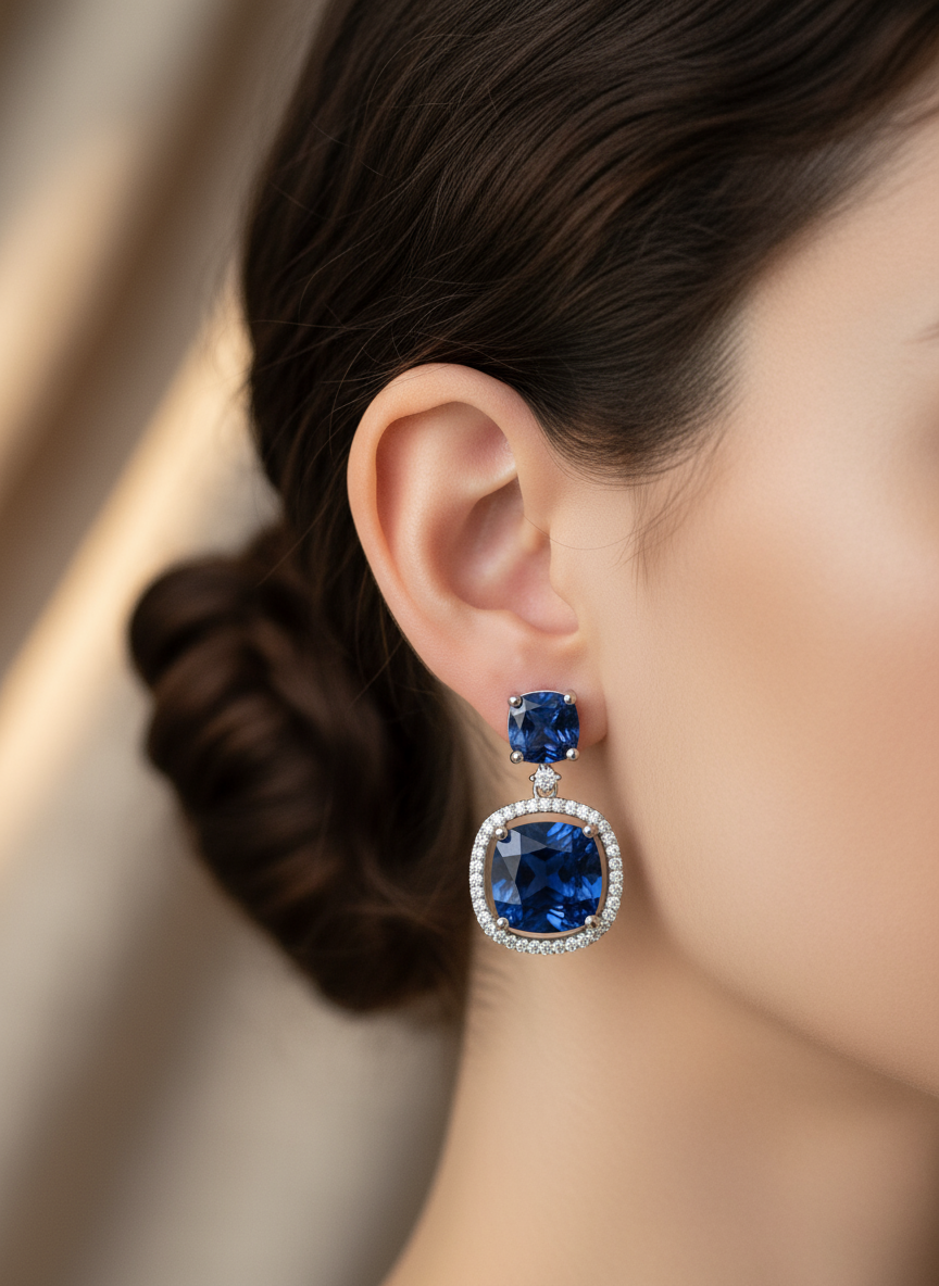 These earrings feature elegant drop studs in white gold, each showcasing a prominent square-cut vibrant stone (green emerald / Red ruby / Blue sapphire) framed by a sparkling pavé diamond halo. The clean, modern design offers subtle dangle movement, blending contemporary sophistication with a pop of rich color perfect for both Western and fusion Indian attire.