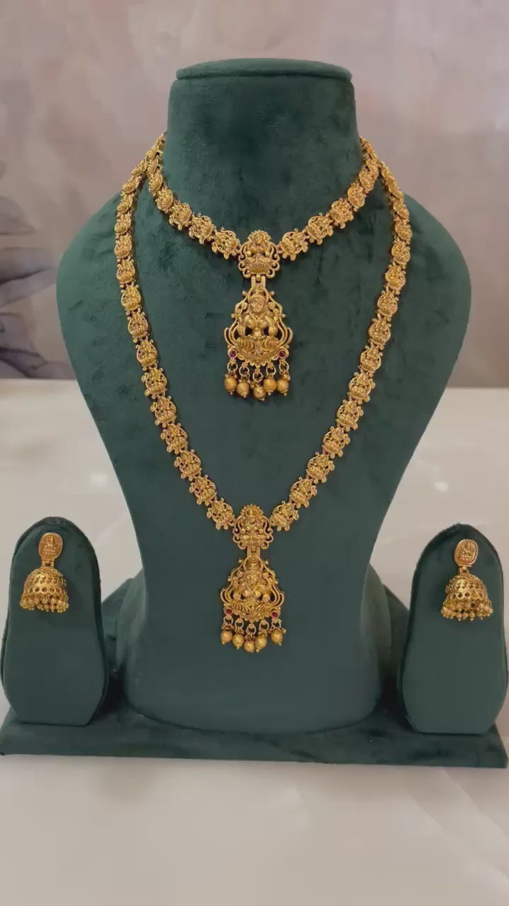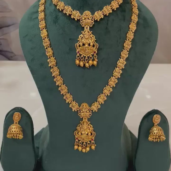 Each necklace is crafted with ornate temple-style links in a rich antique gold finish, enhanced with delicate red stone accents and traditional hanging bead drops. The set is completed with matching temple jhumka earrings, designed to perfectly complement the Lakshmi motifs and intricate detailing of the necklaces.