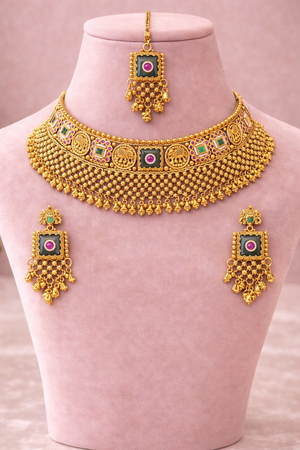 The Vaidehi Royal Temple Choker Set is a majestic expression of traditional Indian temple jewellery. Designed in an original gold polish, the choker features intricately detailed temple motifs accented with emerald-green and ruby-pink stones, bordered by fine gold beading.